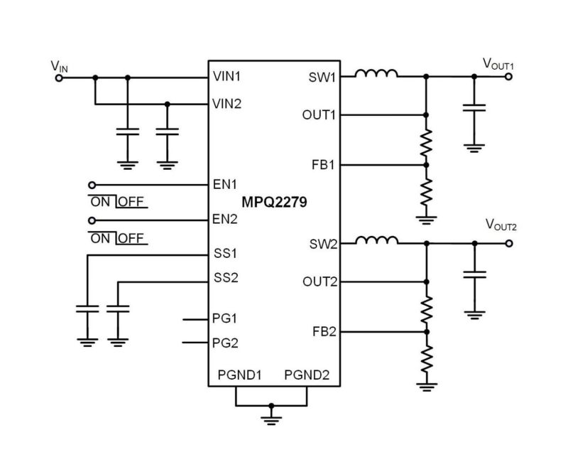 The MPQ2279-AEC1 is a monolithic, dual, step-down, switch-mode converter with built-in internal power MOSFETs. The device achieves 3A/3A of output current (IOUT) from a 2.5V to 6V input voltage (VIN) range, with excellent load and line regulation. The IOUT can be regulated to as low as 0.6V.