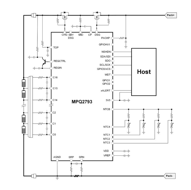 MPQ2793 は、特定のピン上で絶対電圧が 80V を超える、4 セル~16セルのバッテリ パックの直列接続をサポートします。