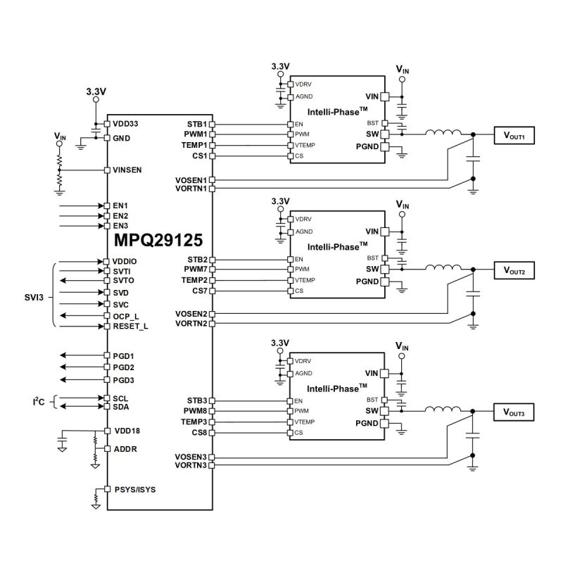 The MPQ29125-AEC1 can work with MPS’s Intelli-PhaseTM products to complete the multi-phase voltage regulator (VR) solution with minimal external components. The MPQ29125’s rails and phases can be configured flexibly.