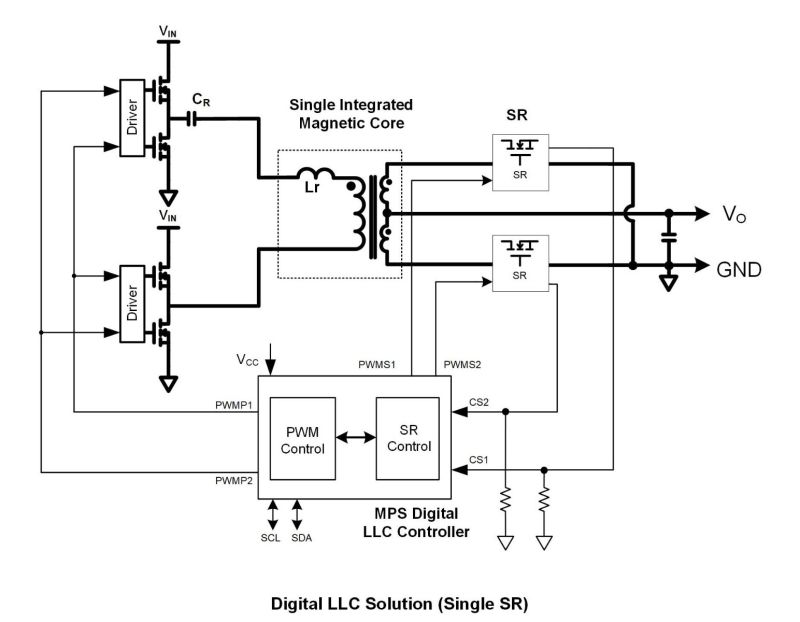 The MPQ2931-AEC1 is a digital LLC controller for full bridges with synchronous rectification control. It provides two pulse-width modulation (PWM) channels for primary-side control, and two PWM channels for secondary-side control.