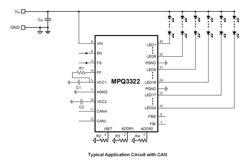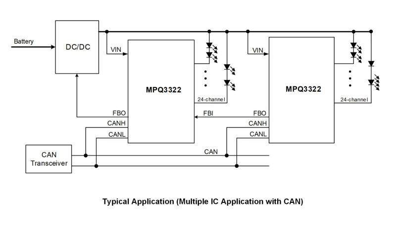 The MPQ3322-AEC1 is a 24-channel LED driver with a 24V voltage rating and maximum 100mA current sources. It is designed to drive LED arrays for backlighting, RGB lighting, and interior ambient lighting in automotive LCD panels and lamps.