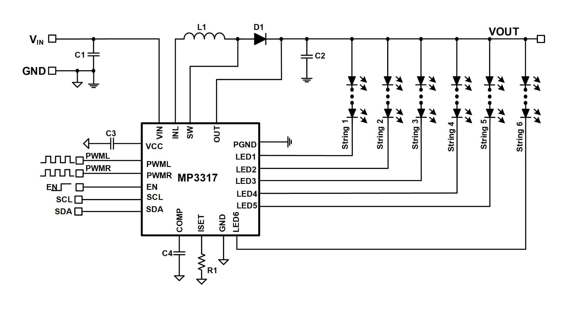 ピーク電流制御は、昇圧コンバータを調整するためのパルス幅変調 (PWM) 制御アーキテクチャとして使用されます。4チャネルの電流源がLEDのカソードに印加され、LEDの輝度を調整します。これは各LEDストリング内の電流を外付け電流設定抵抗で設定された値に調整します。ストリング間の電流調整精度は2.5%です。各チャネルの最大電流は150mAです。MPQ3364の低オン抵抗MOSFETと低ヘッドルーム電圧設計により、効率が向上します。このデバイスには標準のデジタルI2Cインタフェースを備え、柔軟になります。スイッチング周波数 (fSW) は、抵抗、I2Cインタフェース、または外部クロックを介して設定可能です。