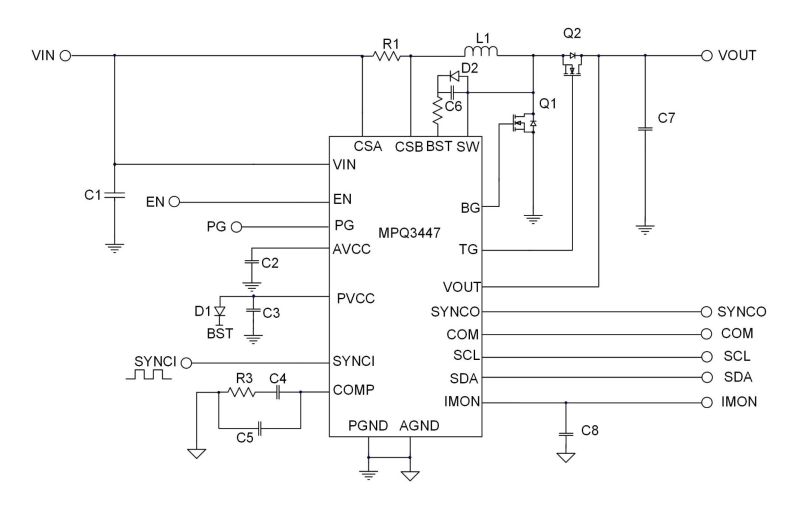 The MPQ3447-AEC1 is available in a QFN-21 (5mmx5mm) package. It is available in AEC-Q100 Grade 1.