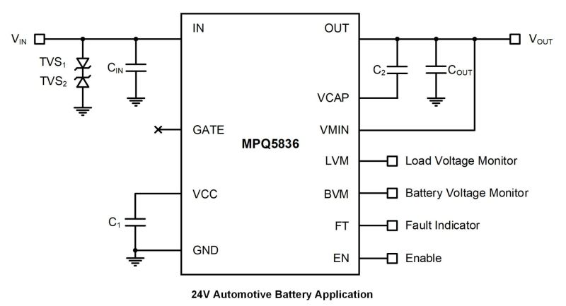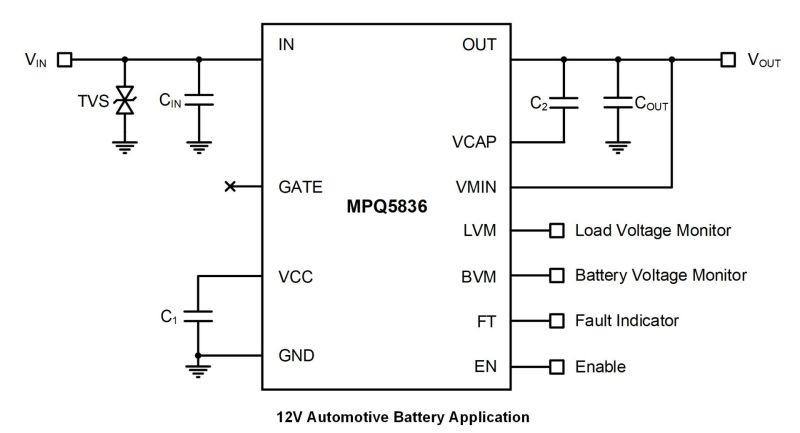The MPQ5836-AEC1 is an integrated smart diode designed to provide a compact solution for 50W to 170W electronic control unit (ECU) systems with the most simplified external circuity.