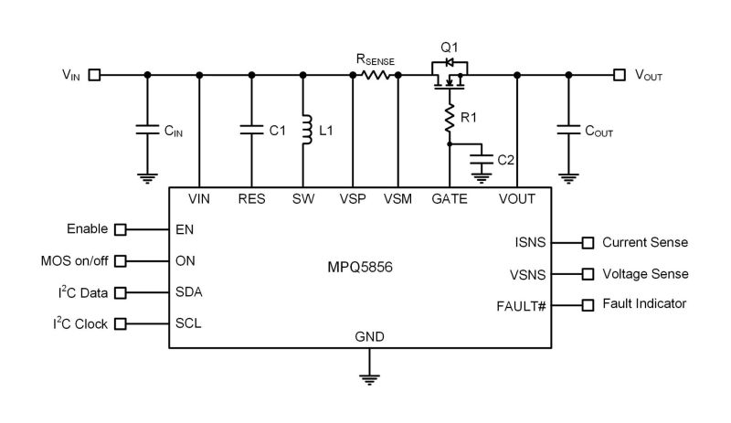 With an internal MOSFET between the output and ground, the MPQ5858-AEC1 features a configurable output discharge function via the I2C interface to shut down the system quickly. A selectable start-up slew rate also helps to reduce inrush current during start-up. In addition, the MPQ5858-AEC1 integrates a configurable, high-accuracy voltage sense and current sense. The sense features can also be turned off to reduce the quiescent current (IQ).