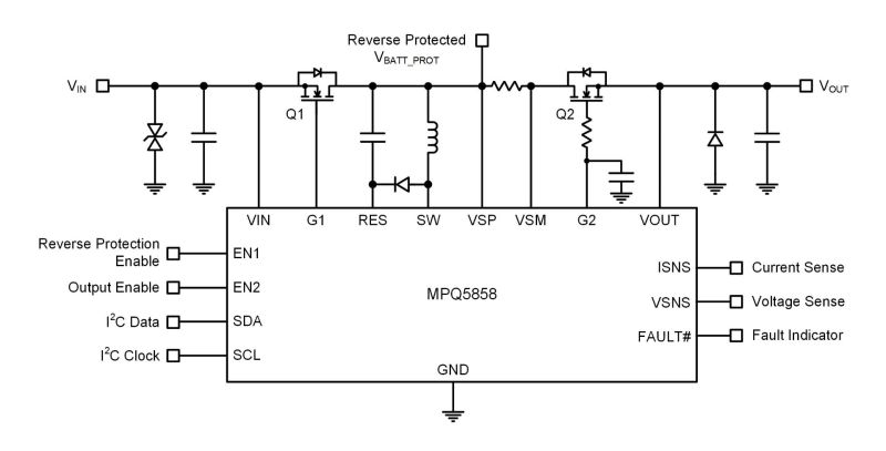 The MPQ5858-AEC1 provides robust protections, including reverse-battery protection, under-voltage protection (UVP), over-voltage protection (OVP), over-current protection (OCP), short-circuit protection (SCP), thermal warning, and over-temperature protection (OTP).