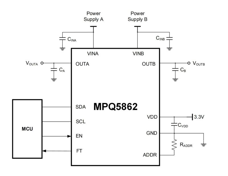 The MPQ5862-AEC1 communicates with the microcontroller unit (MCU) via the I2C interface. The device supports up to 6 addresses, set via an external resistor. With the help of an internal analog-to-digital converter (ADC), the channel currents, supply voltages, reference voltage (VREF), and output voltages can be obtained without additional external circuitry. The device integrates full diagnostics and protections, including input over-voltage protection (OVP) and under-voltage protection (UVP), output OVP for each channel, open-load and short-to-battery detection, over-current protection (OCP), short-circuit protection (fast-off), and over-temperature (OT) shutdown.
