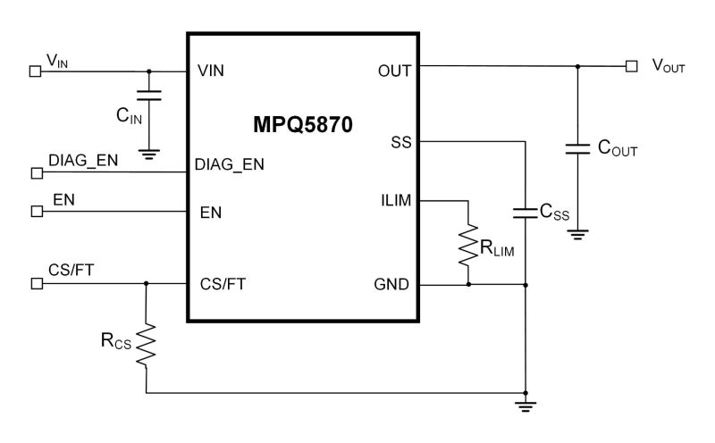 The MPQ5870-AEC1 supports both internal and configurable, high-accuracy external current limits. The device helps clamp inrush current during short circuits, which improves system reliability. An adjustable start-up slew rate also helps reduce inrush current during start-up.