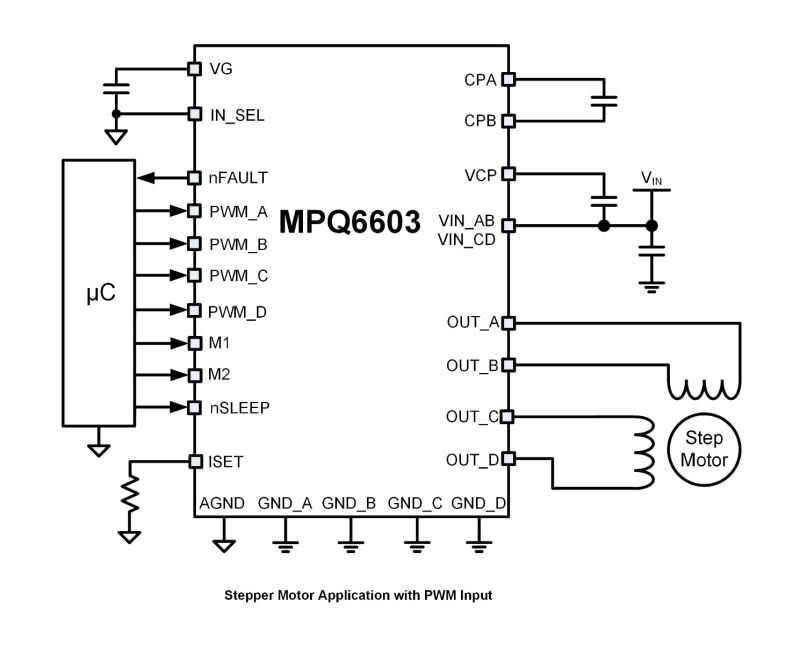Two configurable input modes are available for the MP6603: a pulse-width modulation (PWM) input interface and an indexer interface. The IN_SEL pin configures the input interface.
