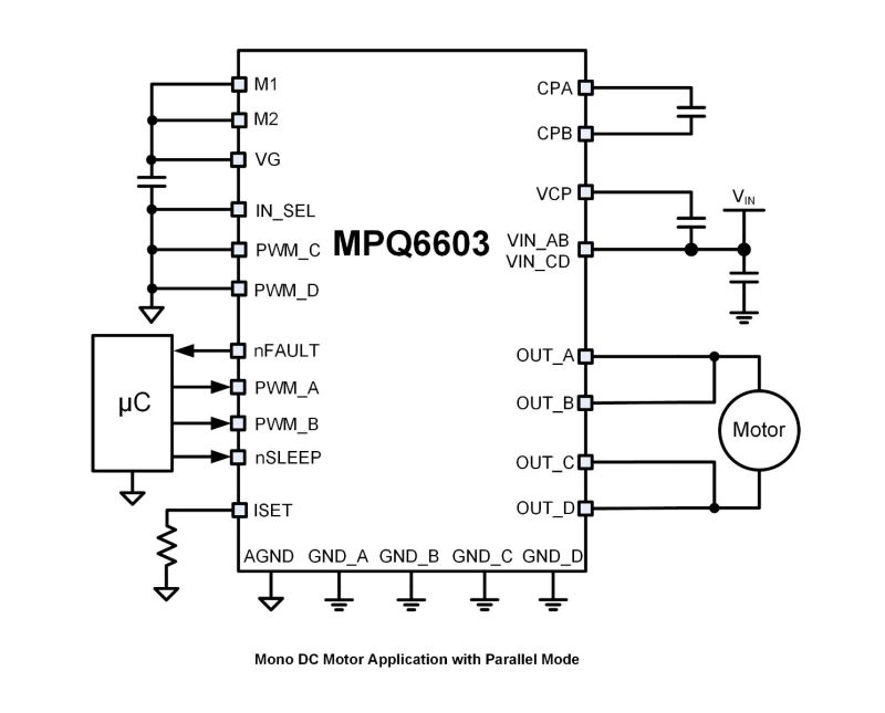 The MP6603 operates across an 8V to 55V input voltage (VIN) range. It can deliver a motor current up to 5A peak per full bridge, depending on the ambient temperature and PCB layout.