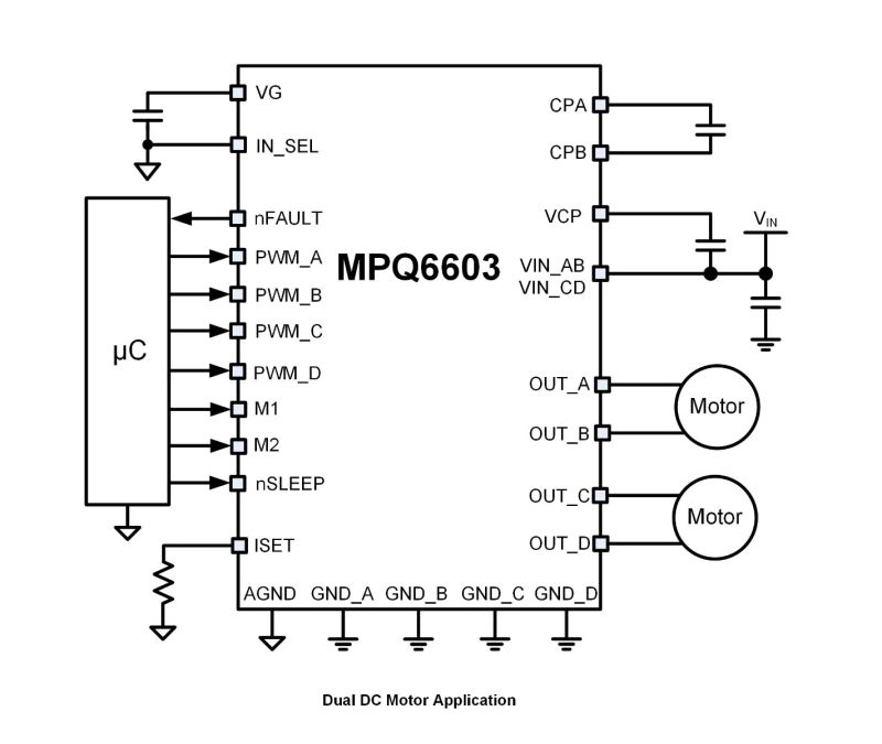 The MP6603 is a dual full-bridge motor driver with integrated low-on resistance (RDS(ON)) MOSFETs.