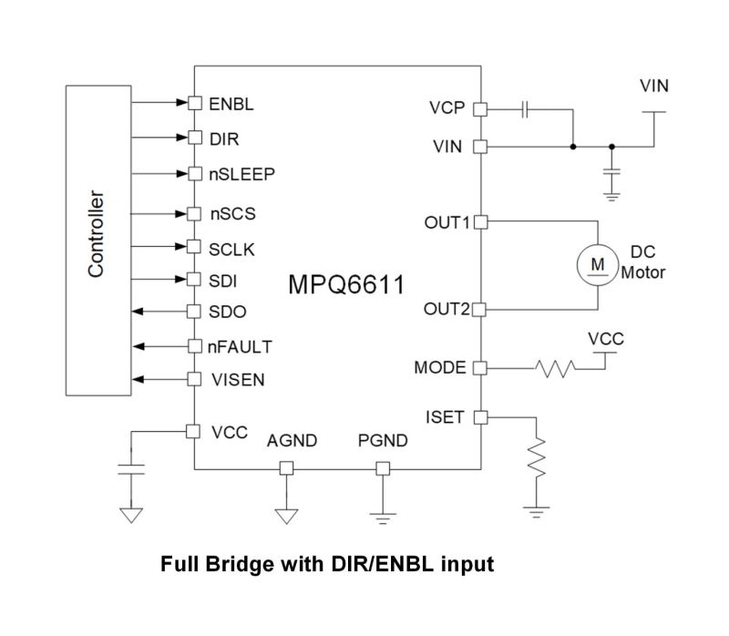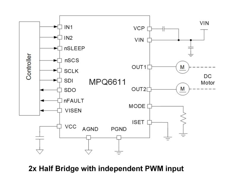 For the MPQ6611-AEC1, control of the outputs is accomplished through the IN1/ENBL/PWM and IN2/DIR/EN pins, through the serial interface, or a combination of both. A mode pin is used to set the control modes, such as the input signal logic (IN1/IN2, DIR/ENBL, or independent pulse-width modulation (PWM)).