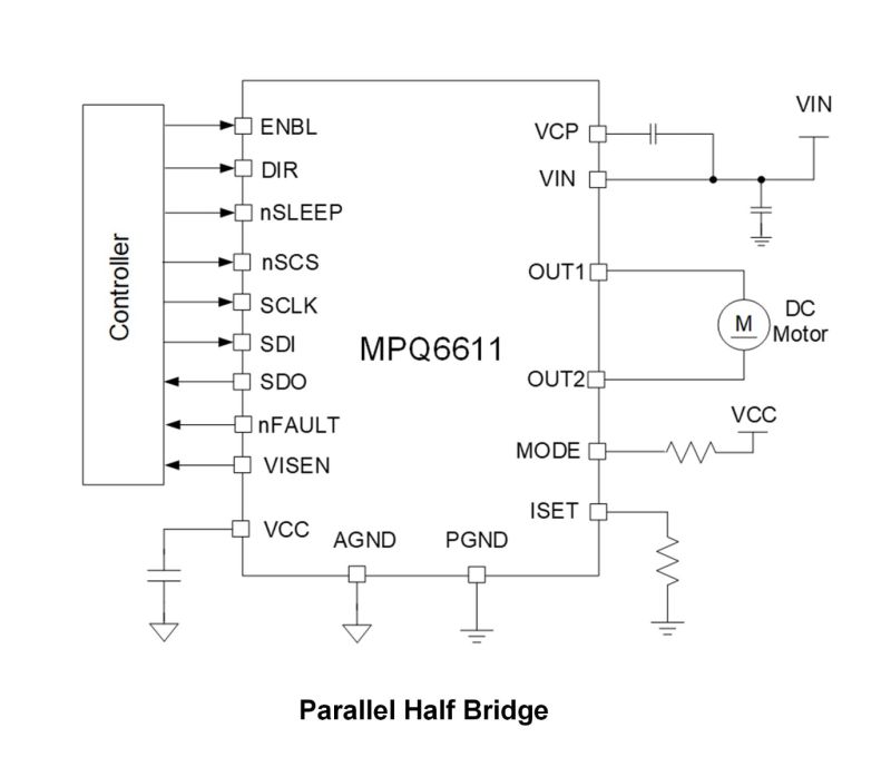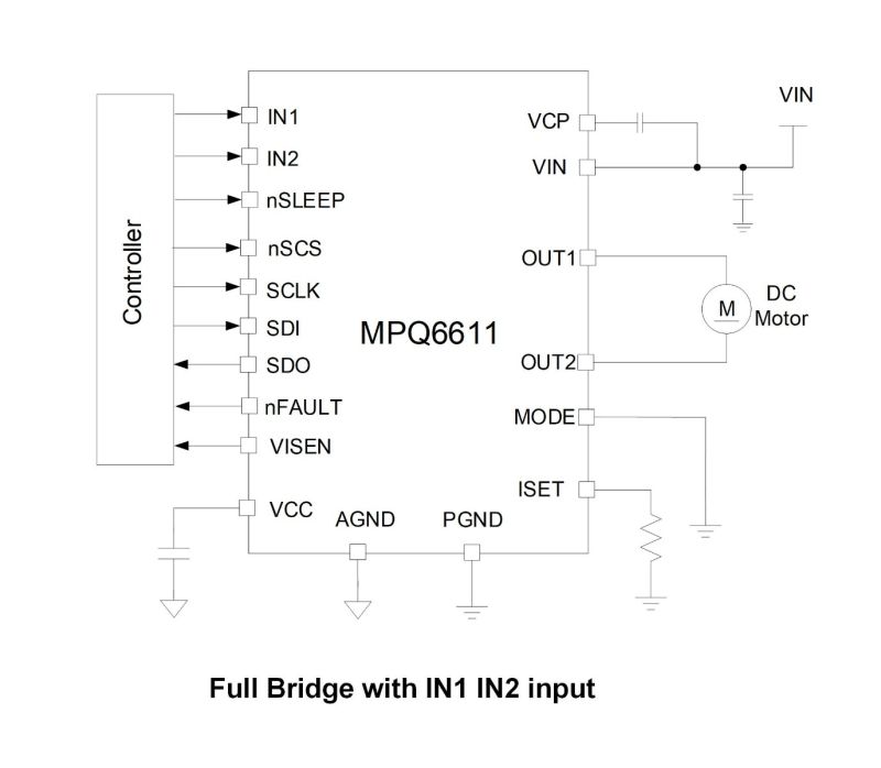The MPQ6611-AEC1 operates on a motor power supply voltage from 2.7V to 32V, and it can supply an output current (IOUT) of up to 7A. A very low standby circuit current can be achieved when the device is disabled.