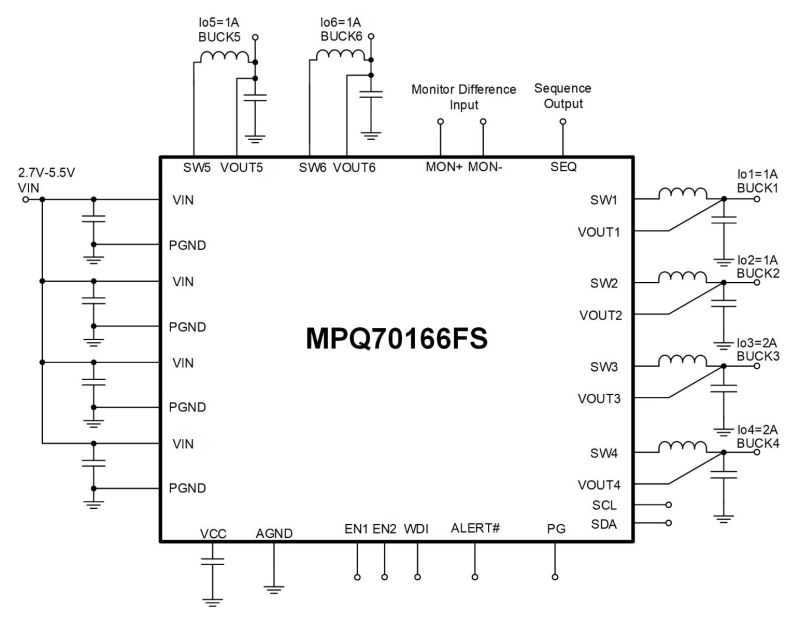 MPQ70161FS-AEC1 MPSafeTM ASIL-D, 5.5V PMIC with 6 Buck Converters (2x 2A and 4x 1A), AEC-Q100 Qualified