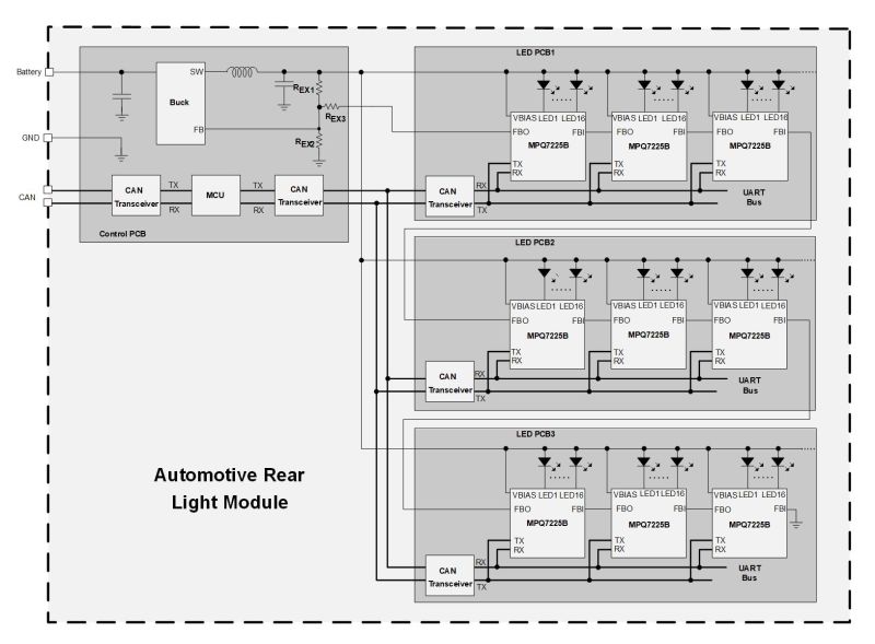 MPQ7228-AEC1製品適応型フィードバック制御 (AFC) とUARTインタフェース付き、16チャネル、電流シンクLEDドライバ、AEC-Q100認定