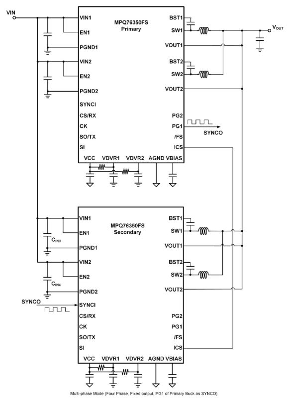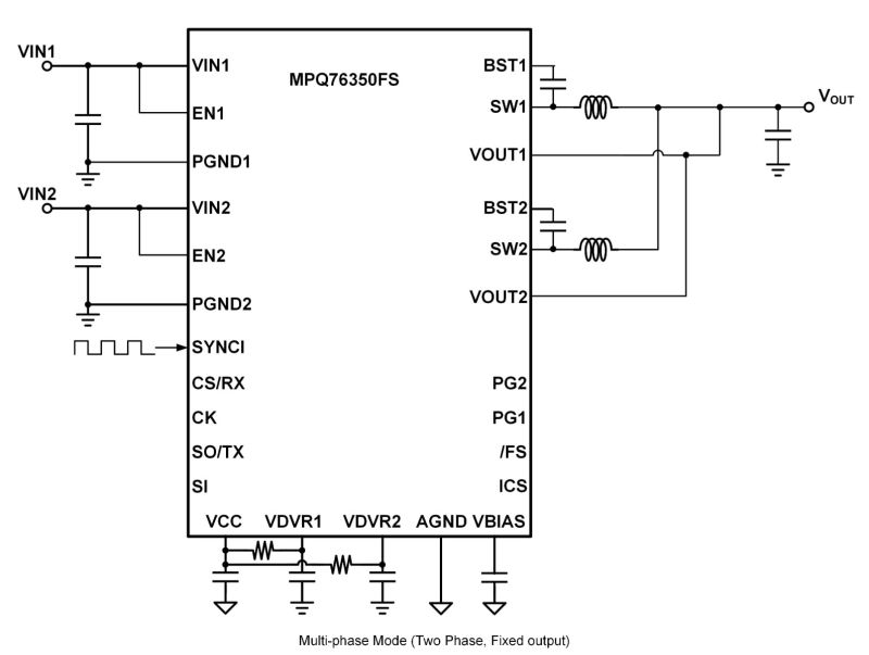 MPQ73350FS-AEC1は、2チャネルモードまたはシングル出力マルチフェーズモードのいずれかの動作を選択できます。2チャンネルモードでは、各降圧の出力電流 (IOUT) は最大7Aで、ヒートシンクを使用すれば12Aの出力電流が可能です。複数のMPQ73350FS-AEC1 チップを並列に配置でき、最大4相まで対応します。スイッチング周波数 (fSW) は200kHz~2.2MHzに設定可能で、外部クロック信号を介して同期できます。周波数拡散スペクトル (FSS) がEMI性能を向上させるために備わっています。