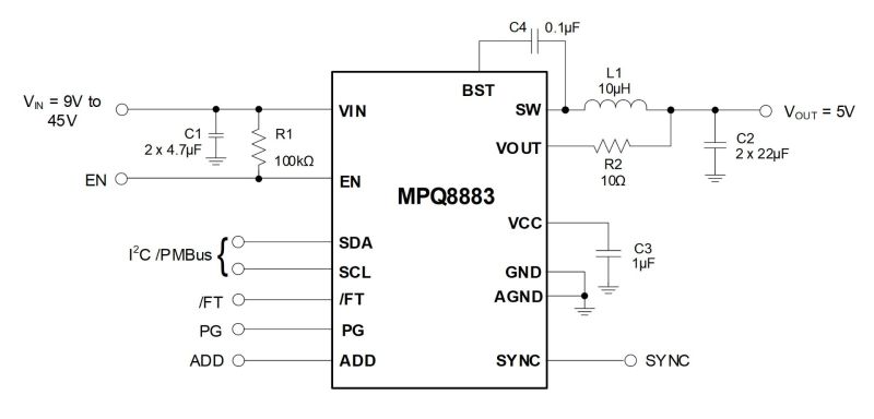 With internal compensation and a feedback divider, the MPQ8883 can offer a very compact solution with a minimal number of readily available, standard external components. It is available in a QFN-16 (3mmx3mm) package.