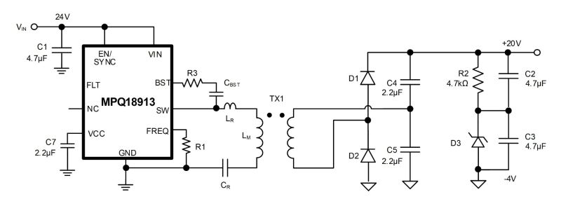 MPQ18913は、幅広くスイッチング周波数 (fSW) を調整可能で、LLCコンバータなどの共振トポロジーで特に役立ちます。また、入力過電圧保護 (OVP)、過電流保護 (OCP)、障害表示機能、および突入電流を制御するソフトスタート (SS) も提供します。