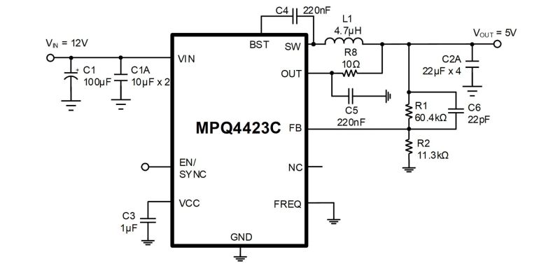 MPQ4423C-AEC1は同期整流モードを提供し、IOUT負荷範囲全体にわたって、より高い効率を実現します。また、高速過渡応答を実現し、ループ安定化を容易にする電流モードも提供します。