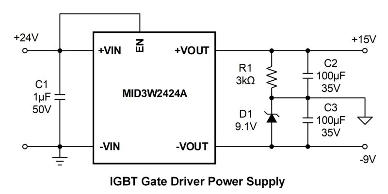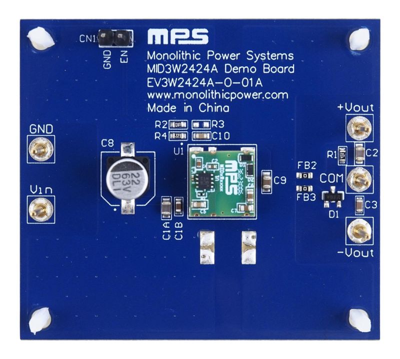 EV3W2424A-O-01Aは、24V ±10%入力電圧 (VIN) アプリケーション向けに設計された、非安定化、3kVRMS、絶縁型DC/DCコンバータであるMID3W2424Aの機能を実証するために設計された評価ボードです。MID3W2424Aは最大3Wの出力電力 (POUT) に対応します。優れたコモンモード過渡耐性 (CMTI) 性能を備えているため、高速スイッチング速度を必要とするIGBTまたはシリコンカーバイド (SiC) MOSFETゲートドライバへの電源供給に適しています。