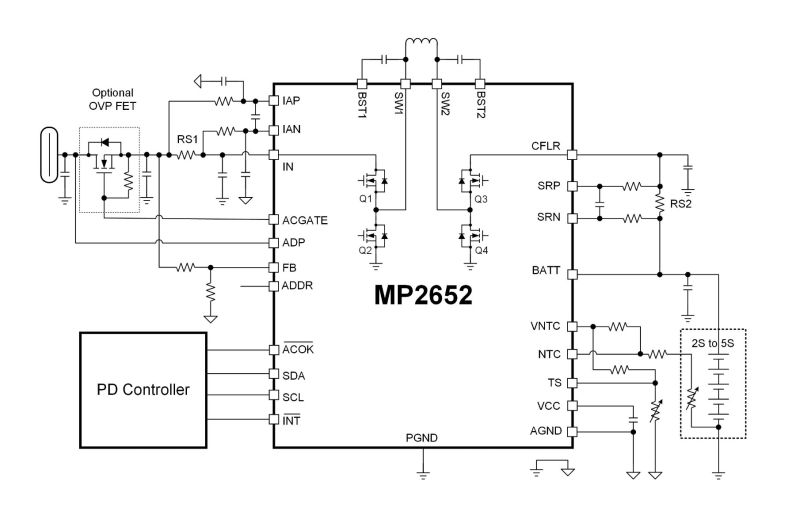 MP2651は、2〜5セル直列のバッテリーパック用に設計された昇降圧型チャージャで、4V~22Vの広い入力電圧 (VIN) 幅を持っています。ソースモードでは、 USB Power Delivery (PD) 仕様に準拠するためにIN端子で5V~21Vの広い幅を供給でき、高分解能の出力電流制限を持っています。