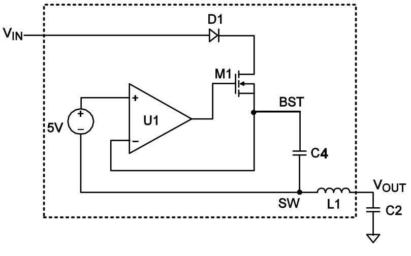 An internal, built-in bootstrap capacitor powers the floating HS-FET driver. When the voltage difference between BST and SW is less than the internal 5V bootstrap regulator, a PMOS pass transistor M1 connected from VIN to BST turns on to charge the bootstrap capacitor. The current path is through D1, M1, C4, L1, and C2 (see Figure 4). If VIN - VSW exceeds 5V, U1 will regulate M1 to maintain a 5V BST voltage across C4. Meanwhile, the external circuit must have enough voltage headroom to accommodate charging. A 10Ω resistor placed between SW and the BST capacitor is strongly recommended to reduce SW spike voltage.