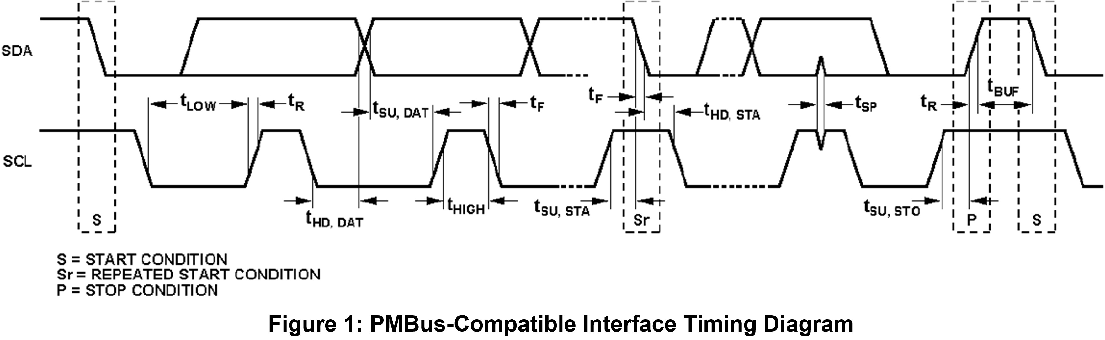 PMBus is a two-wire, bidirectional serial interface, consisting of a data line (SDA) and a clock line (SCL). The lines are externally pulled to a bus voltage when they are idle. Connecting to the line, a master device generates the SCL signal and device address, and arranges the communication sequence. The device interface is a PMBus slave that supports both fast mode (400kHz) and high-speed mode (3.4MHz), adding flexibility to the power supply solution. The output voltage, transition slew rate, and other parameters can be instantaneously controlled via the PMBus interface.